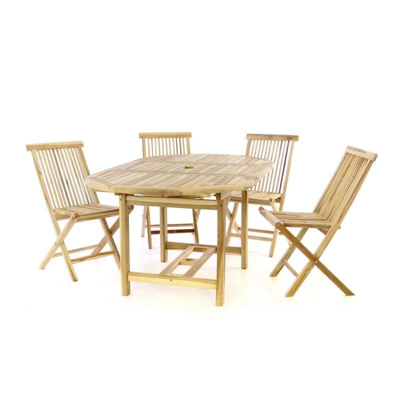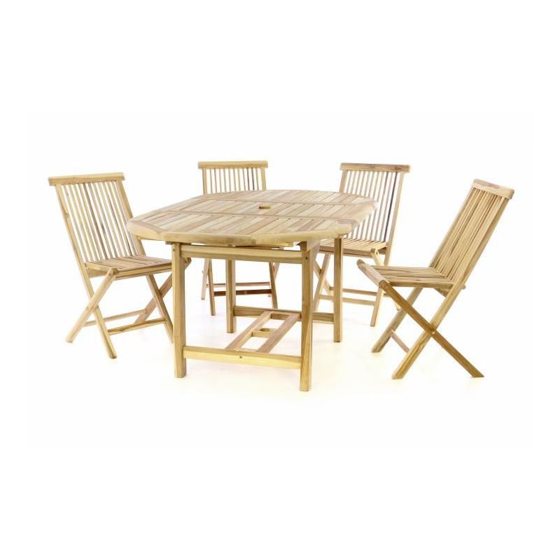 Exkluzivní 5-dílná sestava zahradního nábytku DIVERO se skládá ze 4 masivních židlí s vysokou opěrkou a oválného roztahovatelného stolu. Prodloužení stolu je vybaveno hliníkovou kluznou lištou. Čtyři skládací židle jsou postaveny během okamžiku a díky zaobleným hranám a úzkým lištám jsou i bez sedáků velmi pohodlné.